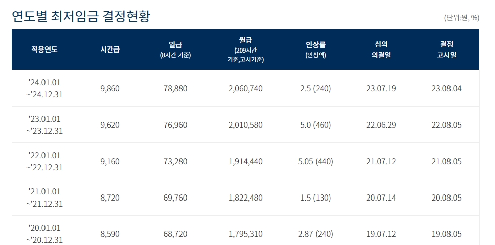 최저임금의 변화 추이는 기간별로 그래프로 표시되어, 사용자가 쉽게 이해할 수 있습니다. 2024년의 최저임금은 전년 대비 2.5% 증가한 240원으로 올라 9,860원으로 설정되었습니다. 다음 해에는 만원이 될 것으로 예상됩니다.