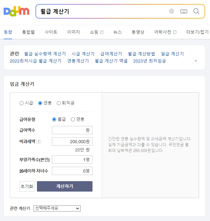 다음 검색엔진에서 월급 계산기를 검색하여, 실제로 근로자가 수령할 수 있는 월급 실수령액을 계산할 수 있습니다.