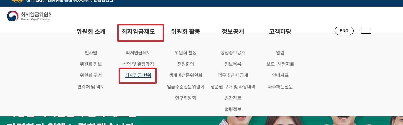 홈페이지 상단의 메뉴에서 최저임금제도를 선택한 후 최저임금 현황을 클릭합니다. 이 메뉴를 통해 최저임금의 변화 추이와 현재 최저임금에 대한 상세 정보를 볼 수 있습니다.