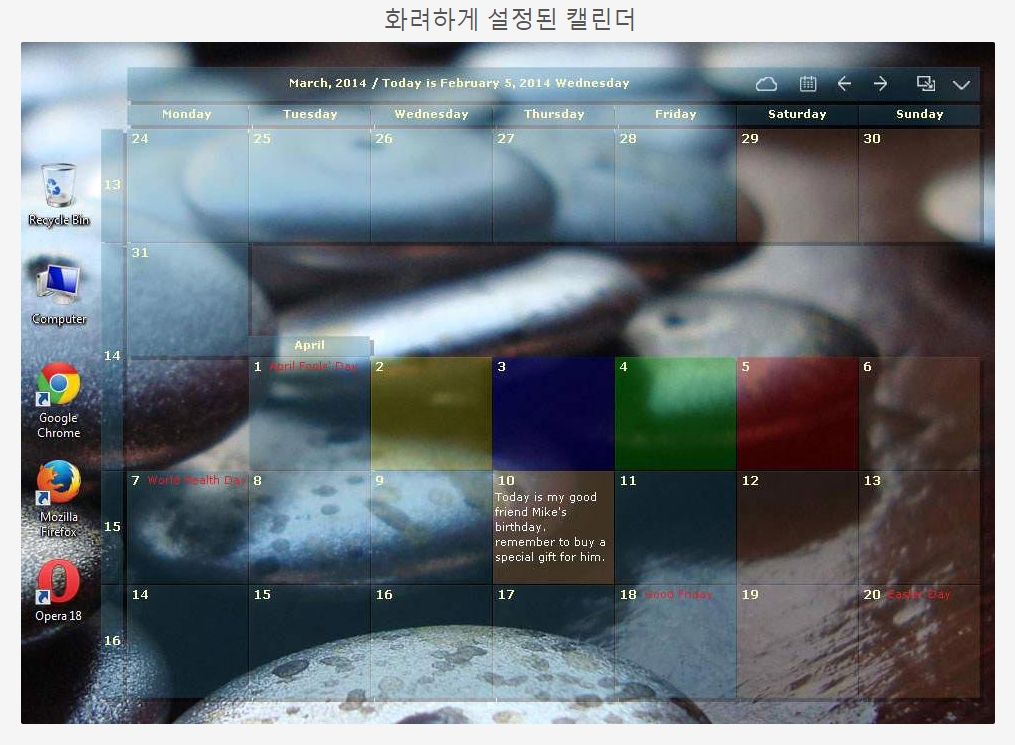 사용자는 캘린더의 색깔을 화려하게 설정하여 개인의 취향이나 기분에 맞게 바탕화면의 분위기를 변경할 수 있습니다. 이는 바탕화면을 더욱 개성 있고 즐겁게 만들어줍니다.
