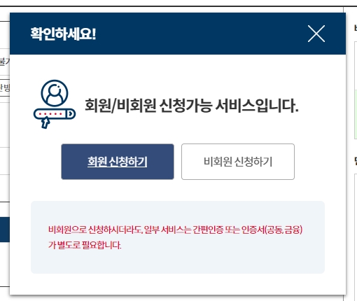 발급하기 버튼을 누르고, 비회원으로 신청하기 위해 비회원 신청하기를 클릭합니다. 약관에 동의하고 필요한 정보를 입력한 후 다음 단계로 넘어갑니다. 이 과정을 통해 사용자는 복잡한 회원가입 절차 없이도 증명서를 신청할 수 있습니다.