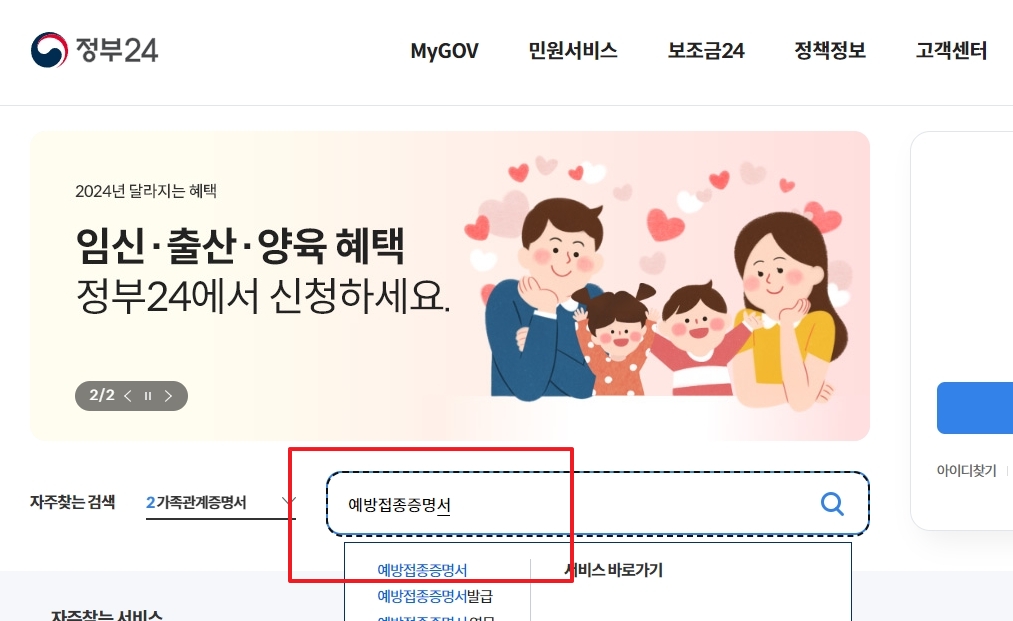 홈페이지의 검색창에서 예방접종증명서를 검색합니다. 검색 결과 중 민원서비스 섹션에서 예방접종증명을 클릭하여 접속합니다. 이를 통해 사용자는 예방접종 증명서 발급을 위한 페이지로 쉽게 이동할 수 있습니다.