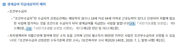 조건부수급자의 경우, 근로능력이 있으나 수급자 선정 요건에는 해당하지 않는 18세 이상 64세 이하의 인원으로, 자활에 필요한 사업에 참가하는 것을 조건으로 생계급여를 지급받게 됩니다. 이들의 소득이 일정 기준 이하일 때 조건부수급자로 선정될 수 있습니다.