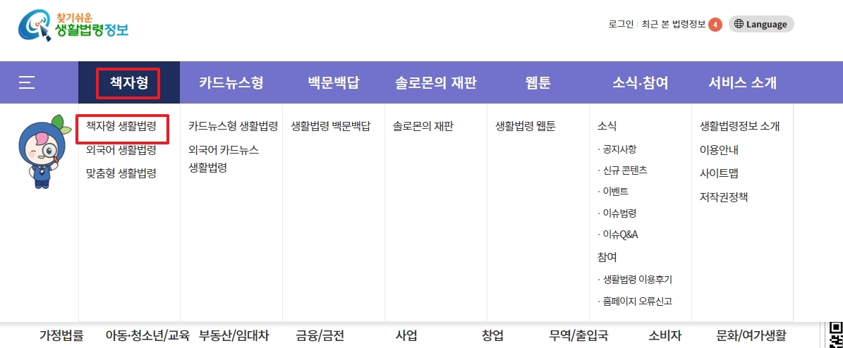 찾기 쉬운 생활법령정보 홈페이지로 들어갑니다. 이곳은 easy law, 이지로 등의 키워드로 검색 가능한, 생활 법령 및 법률 정보를 제공하는 시스템입니다. 사용자는 이 웹사이트를 통해 다양한 법령 정보를 쉽게 찾아볼 수 있습니다.