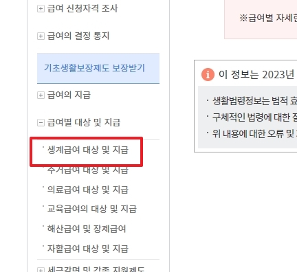 좌측 메뉴에서 기초생활보장제도 보장받기 - 급여별 대상 및 지급 - 생계급여 대상 및 지급을 차례로 클릭합니다. 이 메뉴를 통해 생계급여에 대한 구체적인 정보, 대상자 선정 기준 및 지급 절차 등을 상세하게 알아볼 수 있습니다.