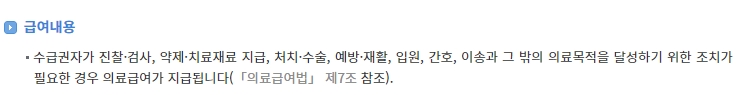수급권자가 진찰, 검사, 약제 및 치료재료 지급, 처치, 수술, 예방 및 재활, 입원, 간호, 이송 등 의료목적을 달성하기 위한 조치가 필요한 경우 의료급여가 지급됩니다.