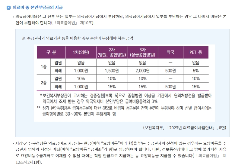 의료비 중 본인부담금은 의료급여비용의 전부 또는 일부를 의료급여기금에서 부담하며, 일부를 부담하는 경우 나머지 비용은 본인이 부담합니다.