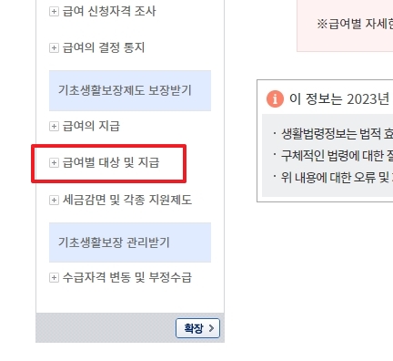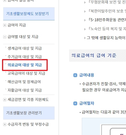 좌측 메뉴에서 기초생활보장제도 보장받기 - 급여별 대상 및 지급 - 의료급여를 차례로 선택합니다. 이 경로를 따라가면 기초생활수급자에게 제공되는 의료급여에 대한 상세한 정보를 확인할 수 있습니다.