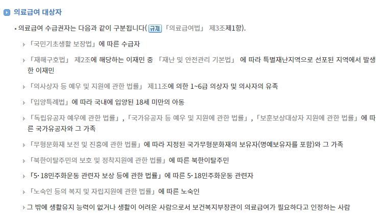 의료급여 수급권자는 「국민기초생활 보장법」에 따른 수급자, 재해구호법에 해당하는 이재민, 의사상자 등 예우 및 지원에 관한 법률에 의한 1~6급 의상자 및 의사자의 유족 등 다양한 대상으로 구분됩니다.