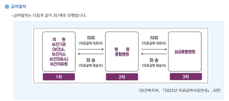 급여 절차는 1차, 2차, 3차 상급으로 의뢰하고 아래로 회송하는 방식으로 진행됩니다.