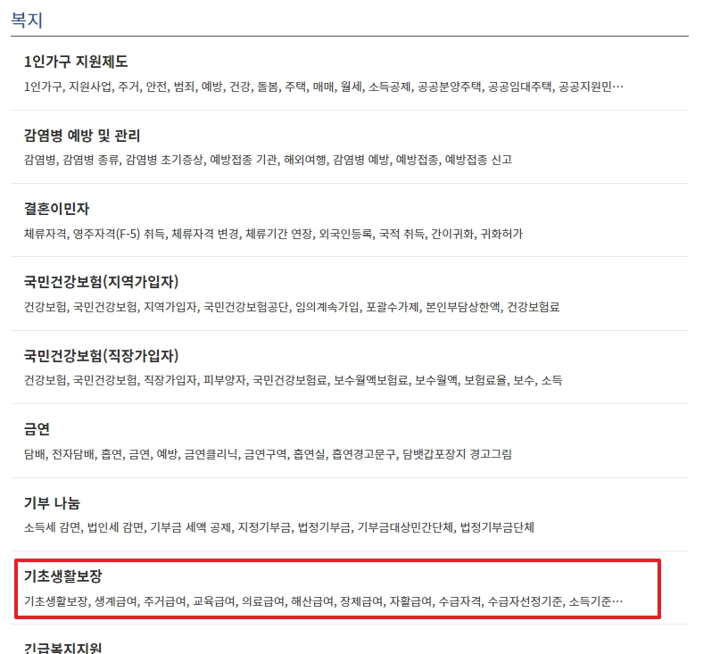 복지 아이콘을 선택한 후 기초생활보장 메뉴로 이동합니다. 이 과정을 통해 사용자는 복지와 관련된 다양한 정보에 접근할 수 있습니다.