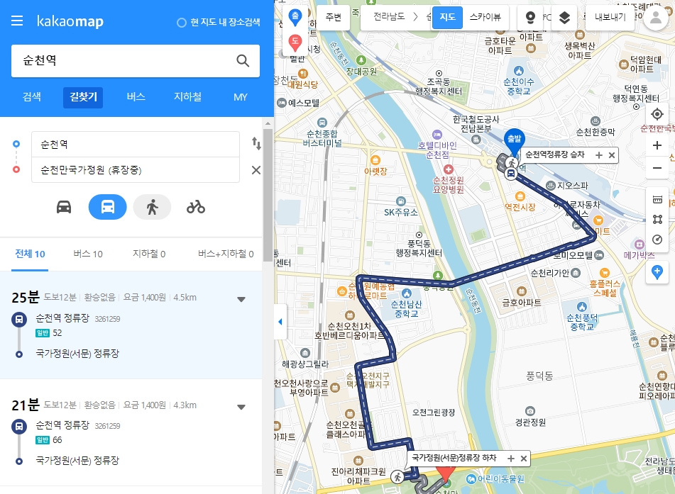길찾기 버튼을 클릭하고, 이후 나타나는 옵션에서 출발을 선택합니다. 이렇게 하면 출발지로 순천역이 설정됩니다.