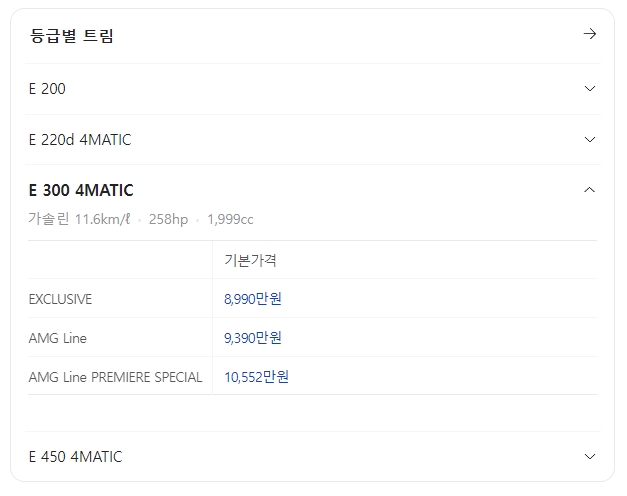 E300 4MATIC 모델에 대한 구체적인 가격 정보를 얻기 위해, 화면을 아래로 스크롤하여 해당 모델을 찾고 클릭합니다. 하위 메뉴에서는 익스클루시브, AMG 라인, AMG 라인 프리미어 스페셜 등 다양한 트림 옵션이 나타납니다. 이 중에서 원하는 트림을 선택할 수 있습니다.