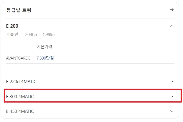 E300 4MATIC 모델에 대한 구체적인 가격 정보를 얻기 위해, 화면을 아래로 스크롤하여 해당 모델을 찾고 클릭합니다. 하위 메뉴에서는 익스클루시브, AMG 라인, AMG 라인 프리미어 스페셜 등 다양한 트림 옵션이 나타납니다. 이 중에서 원하는 트림을 선택할 수 있습니다.