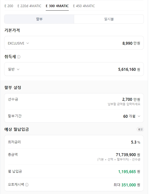 익스클루시브 트림을 선택한 후, 할부를 고려하는 경우 선수금을 입력하고, 할부 기간 동안 매달 납부해야 할 금액을 대략적으로 계산해볼 수 있습니다. 사용자가 입력한 정보에 따라 할부 조건이 계산되어 표시되며, 이는 구매 계획을 세우는 데 유용한 정보를 제공합니다.