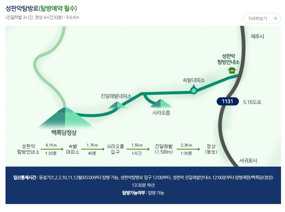 성판악탐방로는 탐방 예약이 필수인 코스로, 진달래밭까지 약 3시간, 정상까지 약 4시간 30분이 소요되는 9.6km의 코스입니다. 이 코스는 탐방 가능 여부에 따라 탐방이 제한될 수 있습니다.