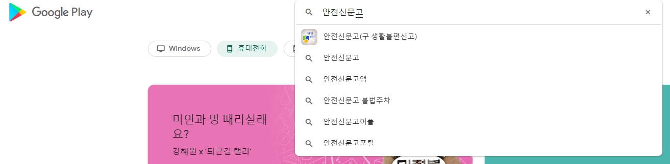 플레이스토어에 접속하여 안전신문고 애플리케이션을 검색합니다. 이 앱은 생활 속 불편사항을 신고할 수 있는 공식 어플리케이션으로, 과거 생활불편신고라는 이름에서 변경되었습니다.