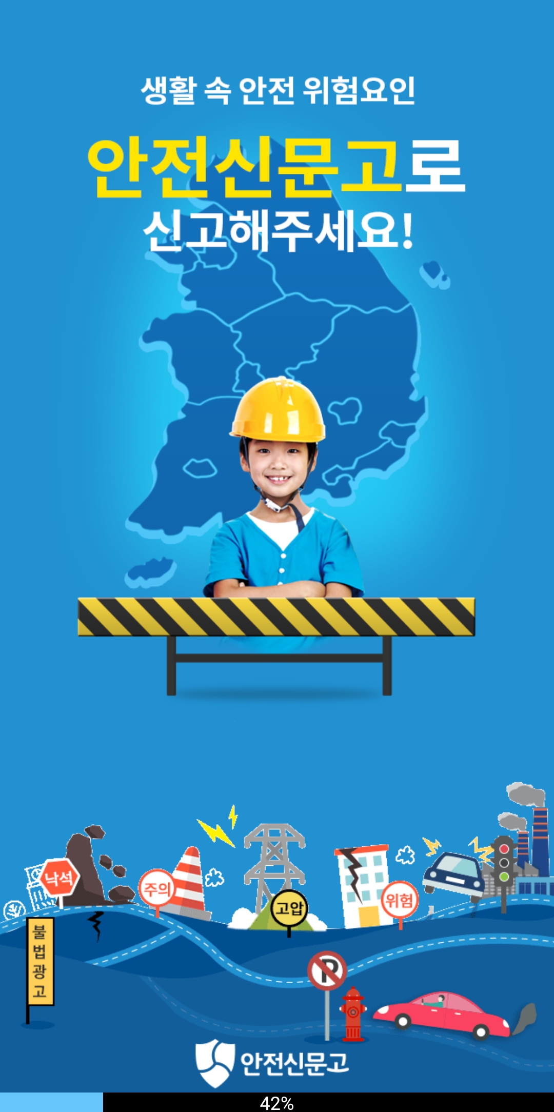앱을 실행시킨 후 로딩이 완료될 때까지 기다립니다. 안전신문고는 다양한 안전 위험요인 신고가 가능하며, 사용자에게 생활 속 안전 위험을 신고할 것을 요청하는 메시지가 표시됩니다.