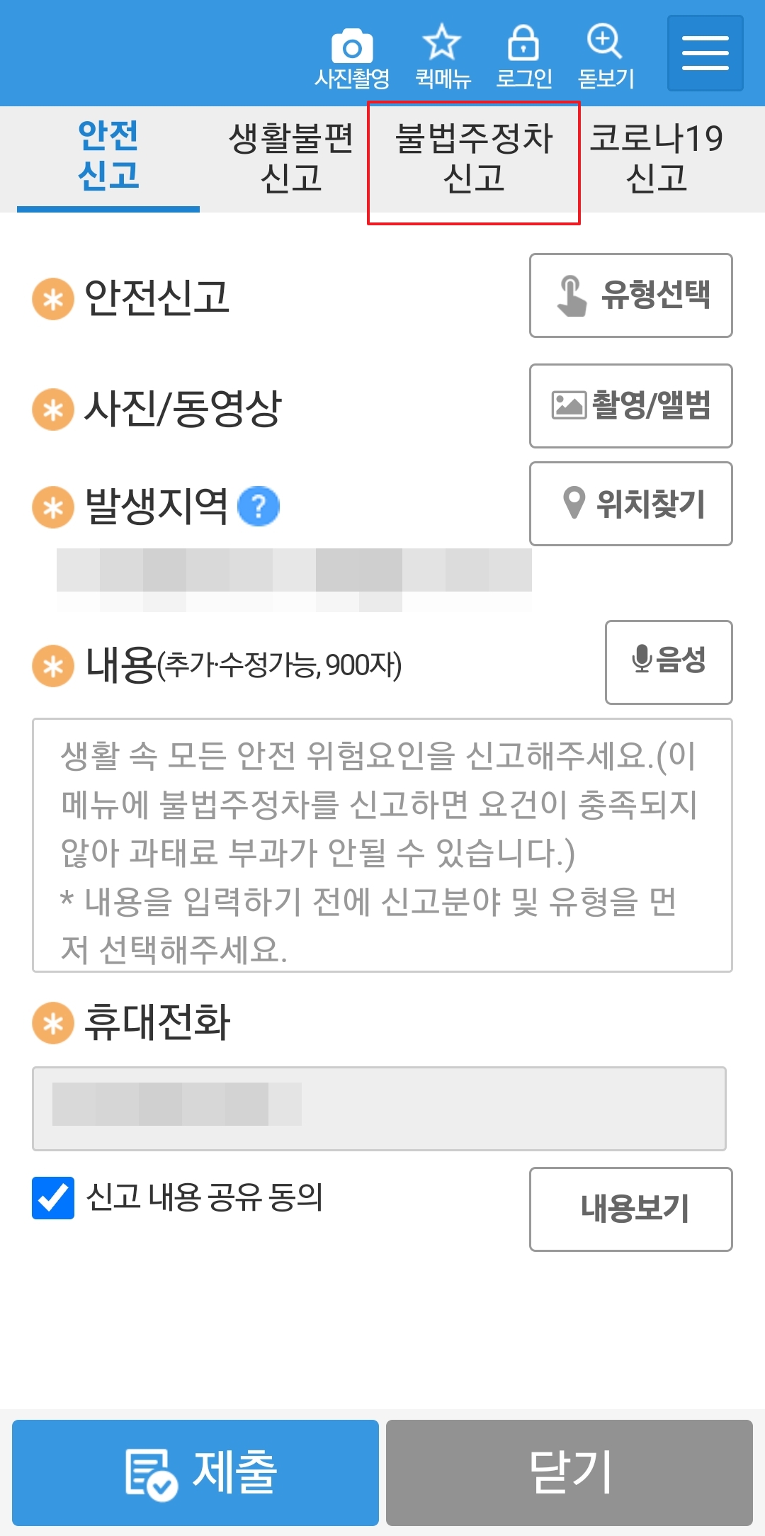 신고 위치를 정확하게 선택하고, 위반 상황을 증명할 수 있는 사진을 첨부한 후, 필요한 내용을 입력합니다. 신고 내용 작성 후, 신고를 제출하면 됩니다.