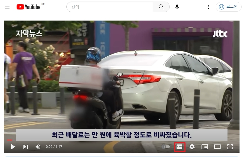 영상을 실행한 후에, 화면을 한 번 클릭하여 재생바와 메뉴를 활성화시킨 다음 CC 버튼이나 자막 표시와 같은 기능을 나타내는 네모난 버튼을 클릭합니다. 이 버튼은 영상에 자막을 표시하거나 숨기는 기능을 담당합니다.