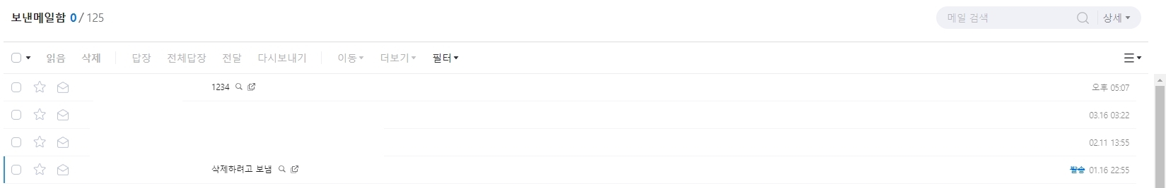이제 좌측의 메뉴에서 보낸 메일함으로 이동해 봅니다. 보낸 메일함에서는 방금 발송한 메일을 포함해 과거에 보낸 모든 메일을 확인할 수 있으며, 발송 취소가 가능한 메일 옆에는 발송 취소 버튼이 나타납니다.