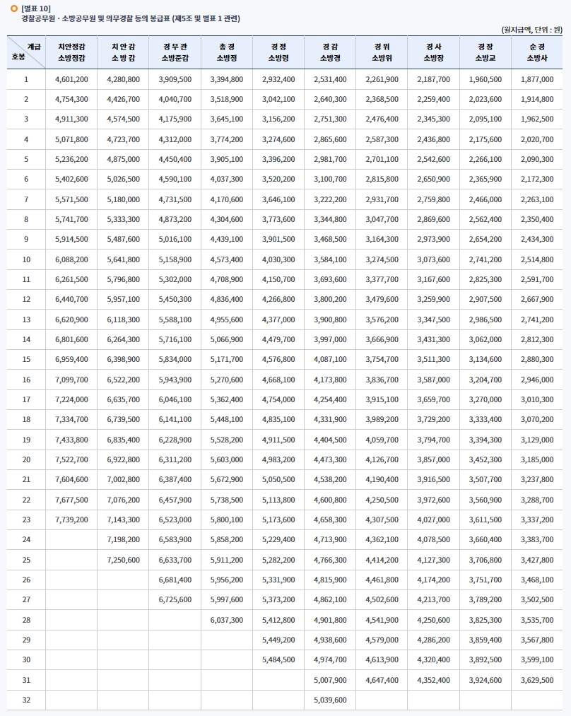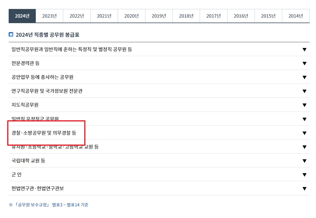2024년도의 공무원 봉급표를 클릭하면 직종별로 세분화된 봉급 정보를 볼 수 있습니다. 여기서 경찰/소방공무원 및 의무경찰을 선택하면 해당 직종에 속하는 공무원들의 봉급 정보를 확인할 수 있습니다. 이 정보는 경찰과 소방 관련 직종을 희망하거나 이미 종사하고 있는 사람들에게 매우 유용합니다.