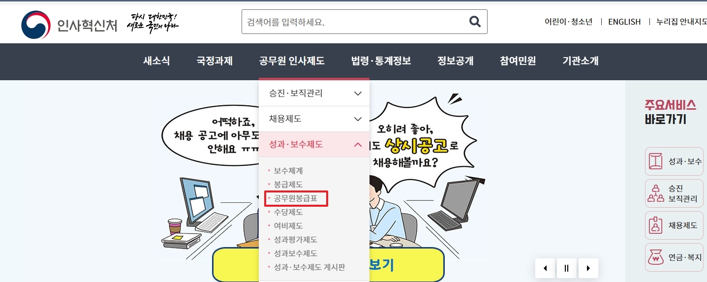 홈페이지 상단 메뉴에서 공무원 인사제도를 찾아 성과보수제도를 클릭한 뒤, 열리는 하위 메뉴에서 공무원봉급표를 선택합니다. 이 과정을 통해 공무원들의 봉급 체계와 관련된 상세한 정보에 접근할 수 있게 됩니다. 성과보수제도와 공무원 봉급표는 공무원들의 급여 구조와 성과에 따른 보상 체계를 이해하는 데 중요한 자료입니다.