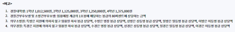 경찰 공무원의 봉급 구조는 기본급 외에도 여러 가지 수당이 포함됩니다. 특히, 야간 근무나 특별한 임무 수행 시 추가로 지급되는 수당이 월급의 상당 부분을 차지합니다. 야간 근무 수당, 위험 수당, 근무 조건에 따른 특수 수당 등이 이에 해당하며, 이러한 수당들은 경찰 공무원이 다른 일반 공무원보다 상대적으로 높은 월급을 받는 이유 중 하나입니다.
