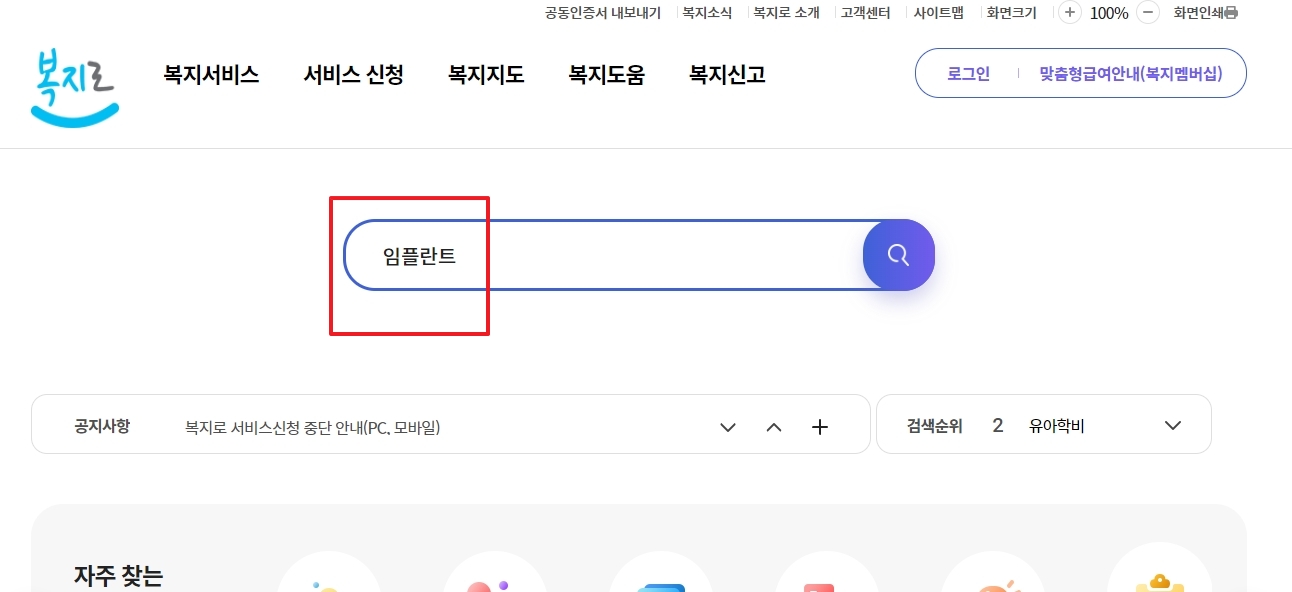 홈페이지의 검색창에 임플란트를 검색합니다. 이 검색을 통해 관련된 복지서비스 목록을 확인할 수 있으며, 이 중에서 관심 있는 서비스를 살펴볼 수 있습니다.
