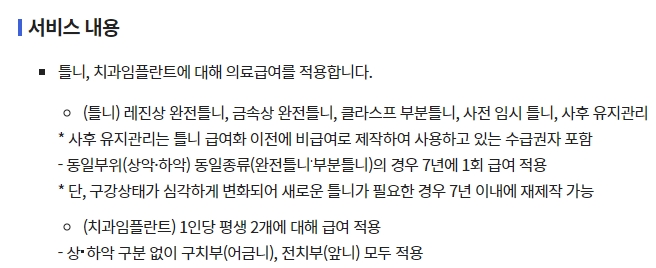 서비스 내용으로는 틀니와 치과임플란트에 대해 의료급여가 적용된다는 점입니다. 틀니에 대해서는 다양한 유형(레진상 완전틀니, 금속상 완전틀니 등)과 사후 유지관리가 포함되며, 치과임플란트는 1인당 평생 2개까지 급여가 적용됩니다.