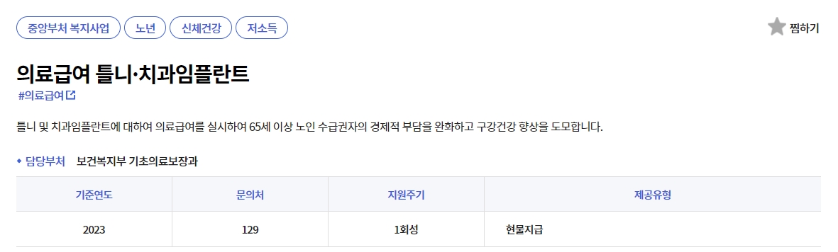 의료급여 틀니·치과임플란트 페이지에서는 이 서비스가 65세 이상 노인 수급권자의 경제적 부담을 완화하고 구강건강 향상을 도모하기 위해 실시되는 것임을 알 수 있습니다. 담당 부처는 보건복지부 기초의료보장과이며, 지원 주기는 1회성이고 제공 유형은 현물지급입니다.