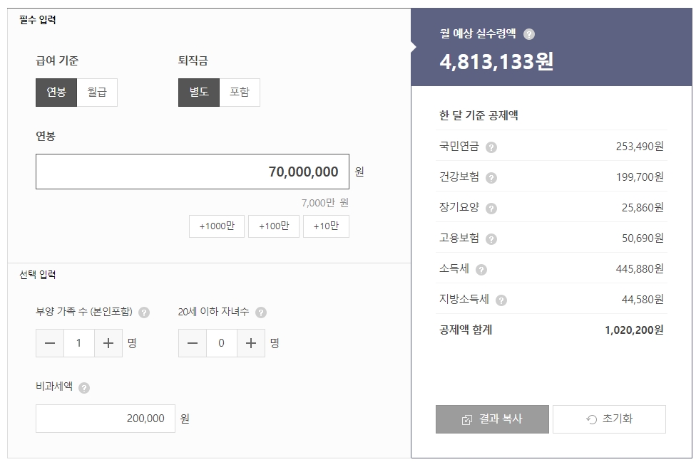 연봉 7000만원을 입력하면, 월 예상 실수령액이 4,813,133원으로 계산됩니다. 또한 공제액 합계는 1,020,200원으로 나오며, 이는 각 항목별 금액도 함께 확인할 수 있어 사용자가 자신의 급여에서 어느 부분이 얼마나 공제되는지 알 수 있습니다.