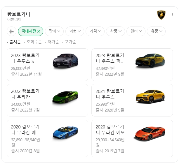 네이버에서 벤츠를 검색하면, 화면 하단에 다양한 벤츠 차량들이 표시됩니다. 이 차량들은 국내 시판을 기준으로 출시 순, 조회수 순, 저가 순, 고가 순으로 정렬할 수 있으며, 사용자는 이 외에도 판매 상태, 외형, 가격, 차종 등 다양한 기준으로 차량을 살펴볼 수 있습니다. 이러한 기능은 사용자가 자신의 관심사와 예산에 맞는 차량을 편리하게 찾을 수 있도록 도와줍니다.