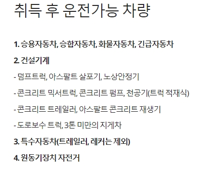 취득 후 운전 가능한 차량에 대한 정보는 승용차, 승합차, 화물차, 긴급자동차, 다양한 건설기계 및 특수자동차 등을 포함하며, 1종 대형 면허를 통해 운전할 수 있는 차량의 범위가 상당히 넓음을 알 수 있습니다. 이러한 차량들은 일반적인 운전 상황 뿐만 아니라 특수한 상황에서도 필요한 운전 기술을 요구합니다.