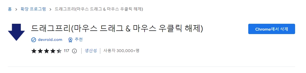 웹스토어 페이지 내의 검색창에 드래그프리를 검색하면, 원하는 확장 프로그램을 찾을 수 있습니다. 드래그프리 검색은 사용자가 웹 페이지에서 마우스 우클릭을 비롯한 여러 제한을 우회할 수 있게 해주는 확장 기능을 찾기 위한 키워드입니다.