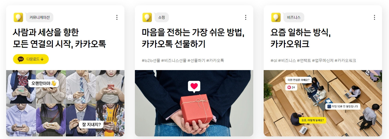 카카오는 일하는 방식의 변화를 추구합니다. 카카오비즈니스와 같은 플랫폼을 통해 사용자는 보다 쉽고 효율적인 업무 수행이 가능하며, 이를 통해 함께 일하는 즐거움을 발견할 수 있습니다. 이와 함께, 헤이카카오를 이용하면 말 한마디로 일상이 편리해지는 경험을 할 수 있으며, 카카오 이모티콘을 통해 새로운 소통의 언어를 만날 수 있습니다.