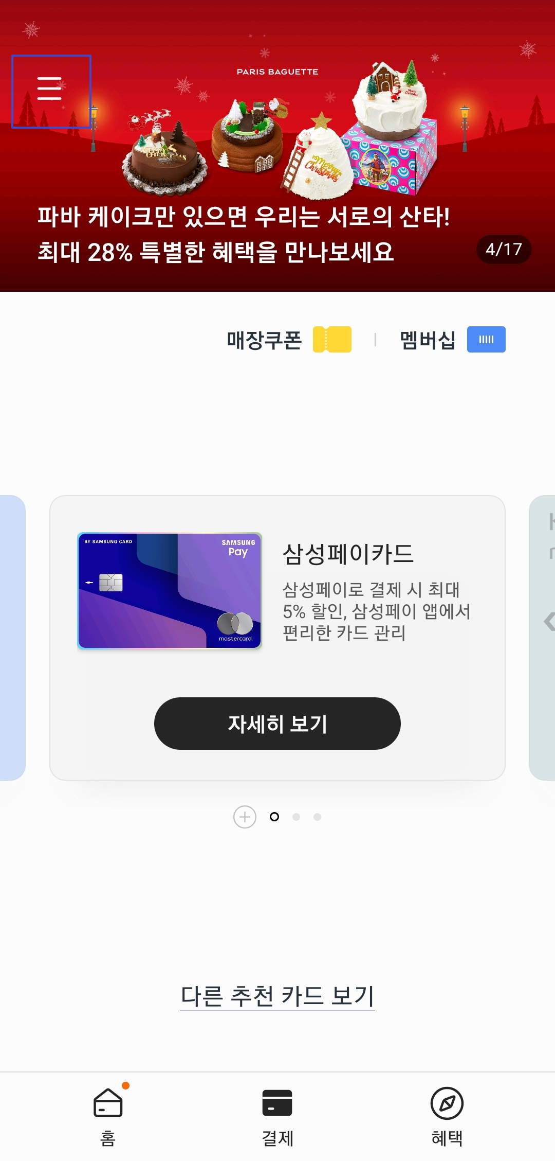 삼성페이 애플리케이션을 실행하고 화면 좌측 상단에 위치한 메뉴 버튼을 클릭한 후, 교통카드 옵션을 선택하여 교통카드 메뉴로 진입합니다.