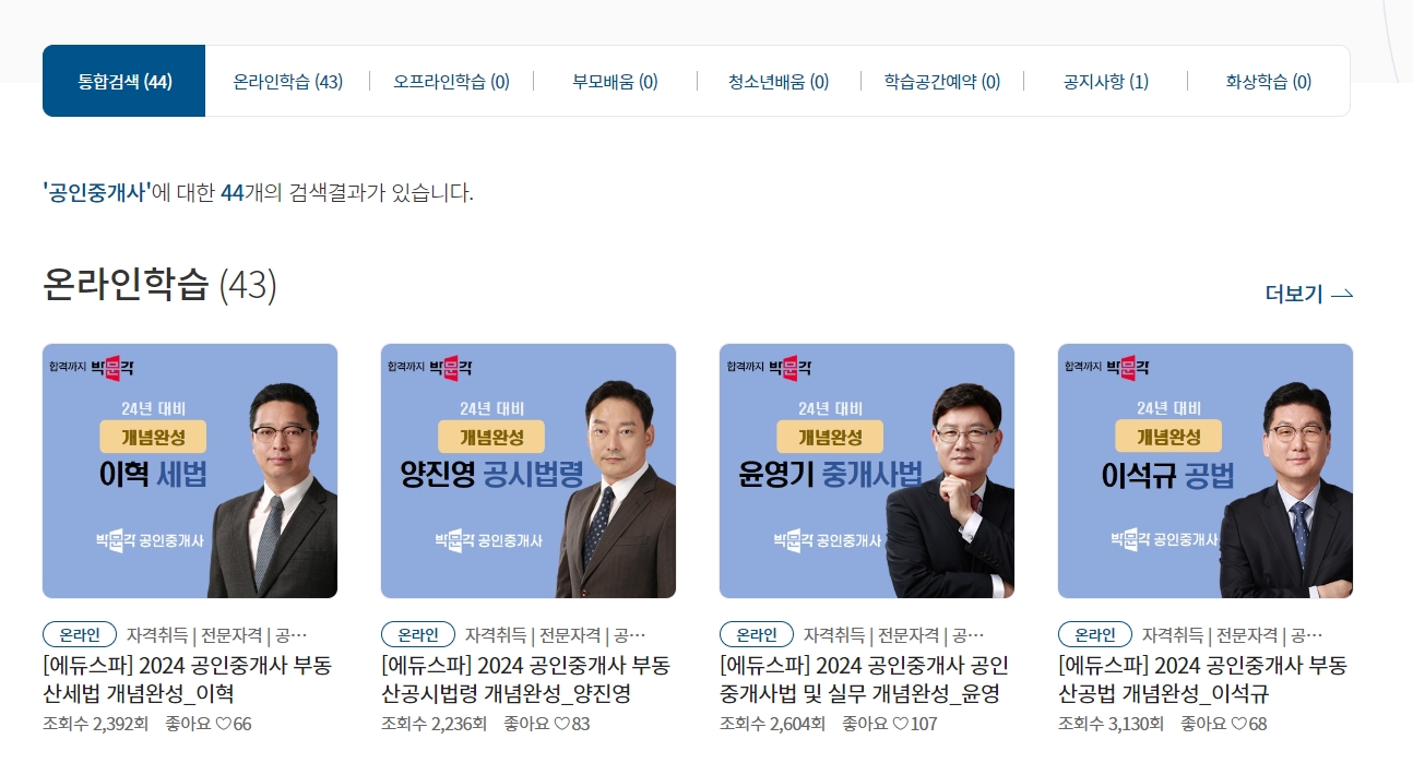 검색 결과로 나타난 43건의 온라인 학습 과정에는 2024년 공인중개사 시험에 필요한 세법, 공시법령, 중개사법, 공법 등의 각 과목별 인강이 포함되어 있습니다. 이 과정들은 공인중개사 시험을 준비하는 데 필수적인 지식과 정보를 제공하며, 사용자가 시험에 성공적으로 대비할 수 있도록 돕습니다.