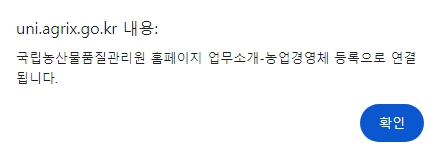 홈페이지 상단 메뉴에서 농업경영체등록이란?을 선택하면, 국립농산물품질관리원 홈페이지의 농업경영체 등록 관련 업무 소개 페이지로 연결되는 알림이 나타납니다. 이는 농업경영체 등록에 관한 구체적이고 상세한 정보를 제공하여 이해도를 높이는 데 도움을 줍니다.