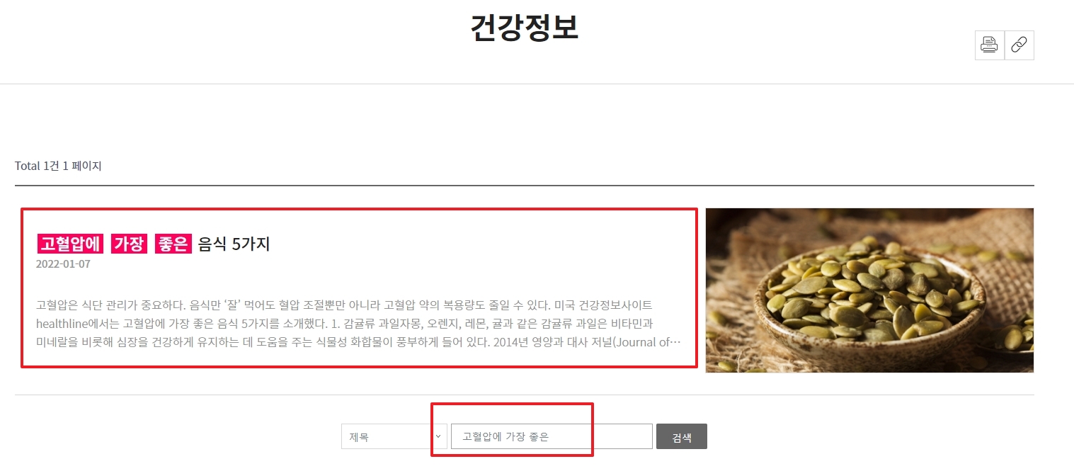 홈페이지의 고객마당 메뉴에서 건강정보 섹션으로 이동하면, 다양한 건강과 관련된 주제들을 검색할 수 있는 기능을 제공합니다. 이곳에서 고혈압에 가장 좋은 음식 5가지를 검색하여 나온 결과를 클릭하면, 고혈압을 낮추는 데 도움이 되는 음식에 관한 정보를 자세히 알아볼 수 있습니다.