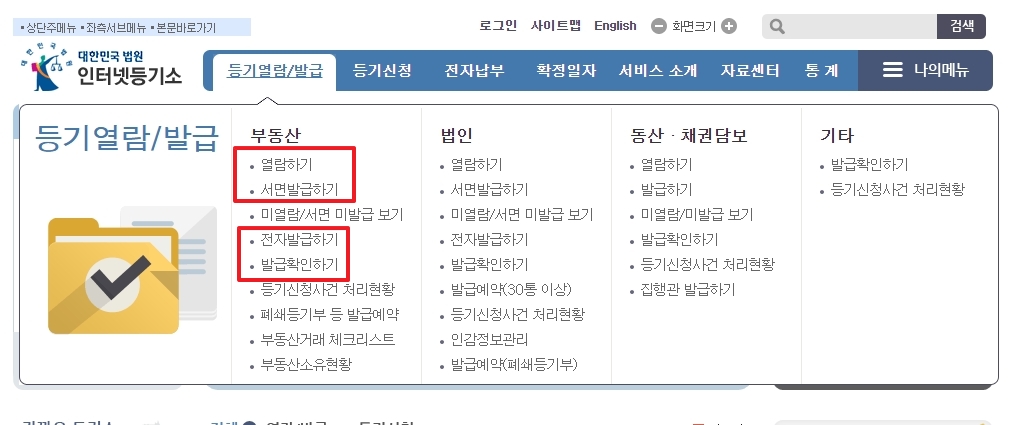 홈페이지의 등기열람/발급 메뉴를 이용하면 등기부등본을 열람하거나 전자적으로 발급받을 수 있는 옵션이 제공됩니다.