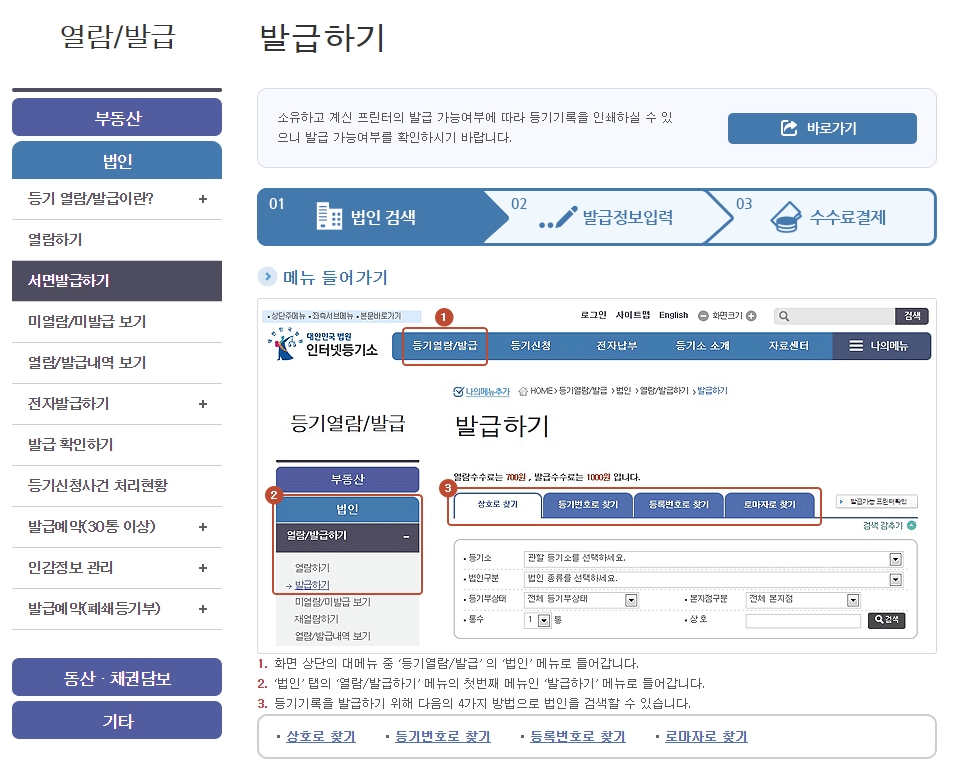 인터넷 등기소 홈페이지의 발급하기 메뉴에서는 사용자가 필요한 정보를 입력한 후, 간단한 절차를 통해 등기부등본을 발급받을 수 있는 방법이 상세하게 설명되어 있습니다.