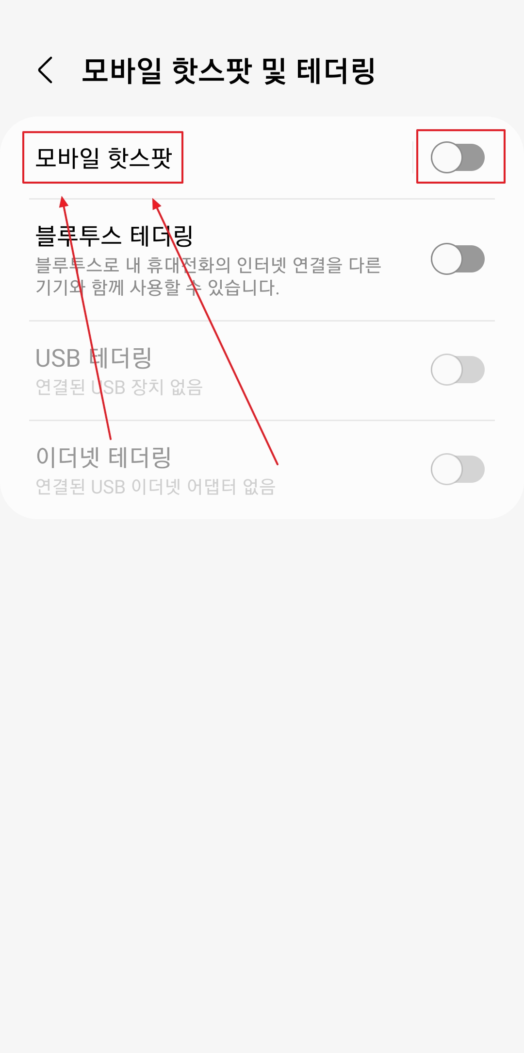 모바일 핫스팟 및 테더링 메뉴 내에서 모바일 핫스팟 옵션이 보입니다. 삼성 갤럭시 사용자 인터페이스의 특징 중 하나는 옵션명과 우측의 토글 버튼이 서로 다른 기능을 수행한다는 것입니다. 모바일 핫스팟 글자 부분을 클릭하면 상세 설정으로 이동하고, 우측의 버튼(토글)을 클릭하면 해당 기능을 켜고 끌 수 있습니다. 글자와 버튼 사이에는 연한 줄로 구분이 되어 있어 둘의 기능이 다름을 시각적으로 구별할 수 있습니다.