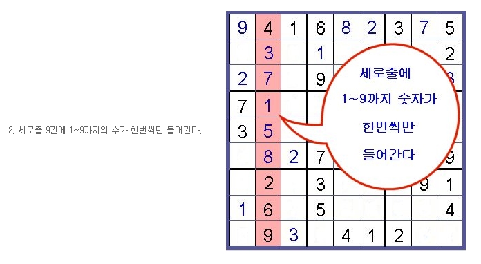 가로줄에 대한 규칙은 9개의 칸 모두에 1부터 9까지의 숫자가 한 번씩만 들어가야 합니다. 이는 스도쿠 게임의 기본 중의 기본이며, 플레이어는 이 규칙을 염두에 두고 숫자를 배치해야 합니다.