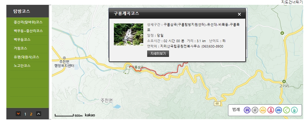 구룡계곡코스를 자세히 살펴보시면, 탐방로의 높이와 구간별 난이도가 색깔별로 표시되어 있어, 탐방객들이 거리와 소요 시간을 쉽게 확인할 수 있습니다. 이러한 세부 정보는 등산을 계획하는 데 매우 중요한 역할을 하며, 탐방객들이 자신의 체력과 경험에 맞는 코스를 선택하는 데 도움을 줍니다.
