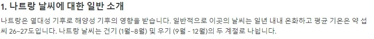 나트랑은 열대성 기후의 영향을 받는 지역으로, 해양성 기후의 특성 덕분에 연중 온화하고 평균 기온은 약 섭씨 26~27도를 유지합니다. 나트랑은 건기(1월~8월)와 우기(9월~12월)의 두 계절로 나뉘며, 각 계절마다 나트랑을 여행하는 데 적합한 특징을 가지고 있습니다.