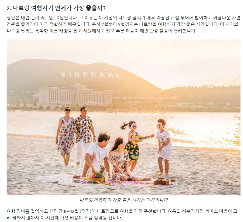 나트랑 여행의 최적 시기는 1월부터 9월까지의 건기로, 이 시기에는 아름다운 자연 경관을 즐기기에 적합한 날씨를 경험할 수 있습니다. 특히 7월부터 9월까지는 나트랑을 여행하기에 가장 좋은 시기로 꼽히며, 비용을 절약하고자 한다면 우기인 10월부터 12월에 여행을 계획하는 것도 좋은 선택이 될 수 있습니다.