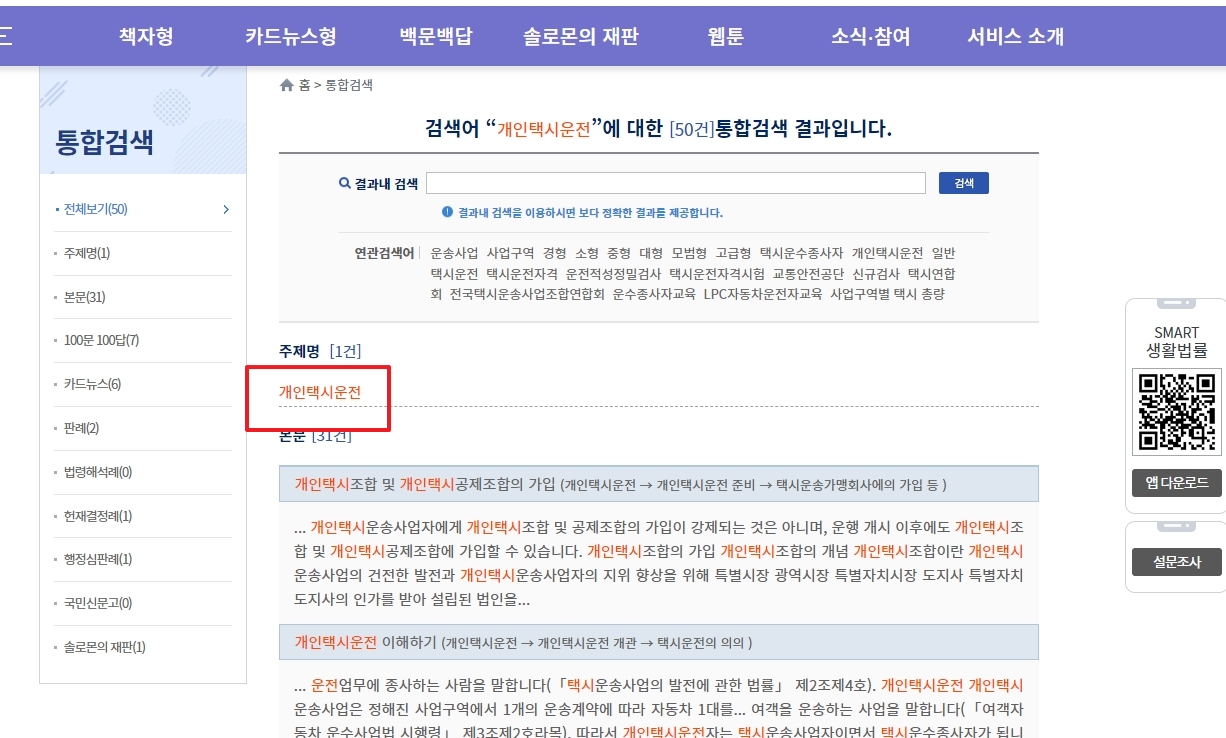 홈페이지의 검색 기능을 활용하여 개인택시운전을 검색하면, 관련 주제명을 클릭하여 개인택시 운전에 필요한 자격 조건과 관련 정보를 확인할 수 있습니다. 이 과정은 개인택시 운전을 준비하는 데 필수적인 단계입니다.