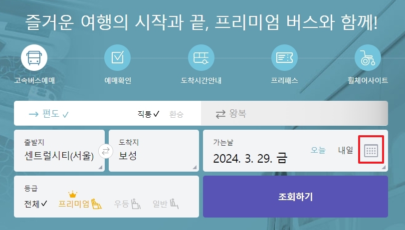 여행 날짜를 선택하는 과정도 간편했습니다. 달력 모양의 아이콘을 클릭해 원하는 날짜를 선택한 후, 조회하기 버튼을 누르면 그 날짜에 해당하는 버스 시간표를 볼 수 있었습니다. 이 시스템 덕분에 여행 계획을 세우기가 한결 수월했습니다.