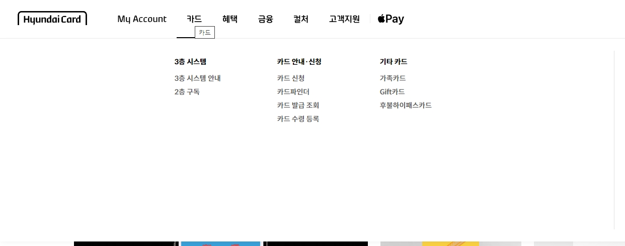 홈페이지의 메뉴목록에는 여러 가지 유용한 항목들이 있어요. 카드안내/신청 메뉴에서는 현대카드의 다양한 카드 상품을 비교하고, 자신의 소비 스타일과 필요에 맞는 카드를 찾아 신청할 수 있습니다. 카드발급조회 메뉴를 통해서는 카드 발급 진행 상황을 확인할 수 있죠.
